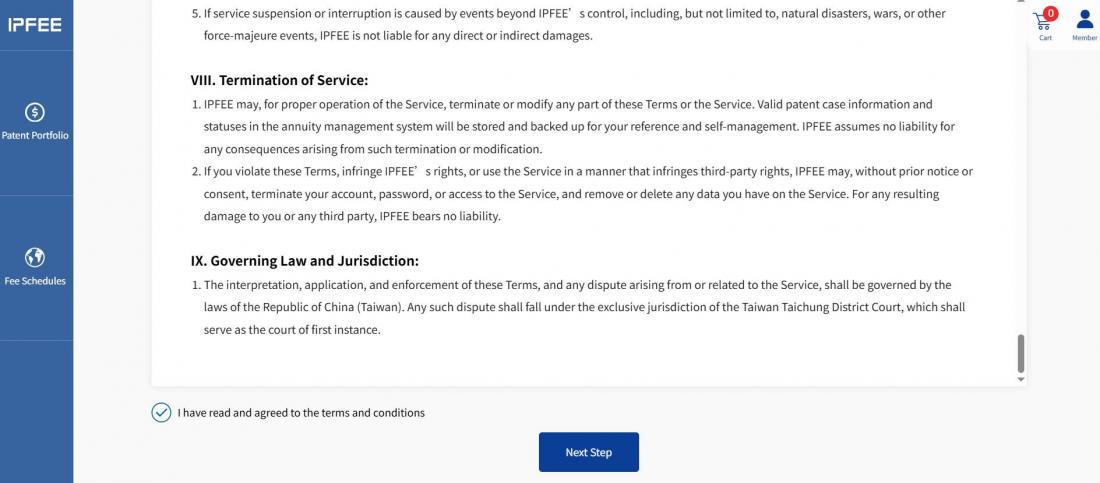 ★ Review the Terms of Service, check "I have read and agree to the terms and conditions", then click Next Step to continue.