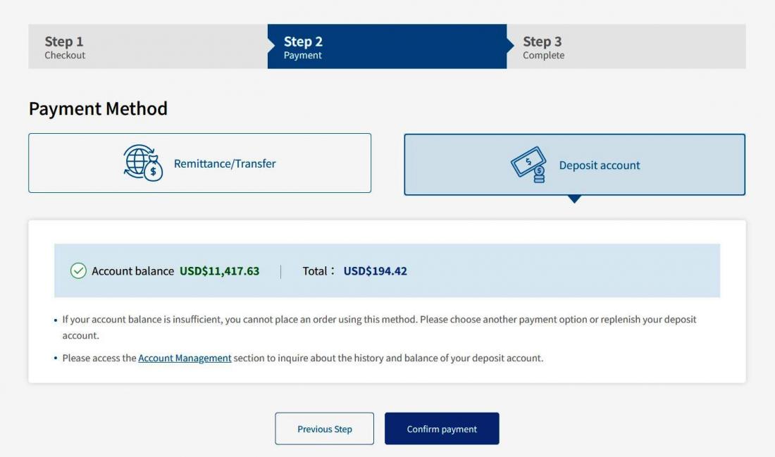 → If you select Deposit Account Payment, your deposit account balance and payable amount will be displayed.
