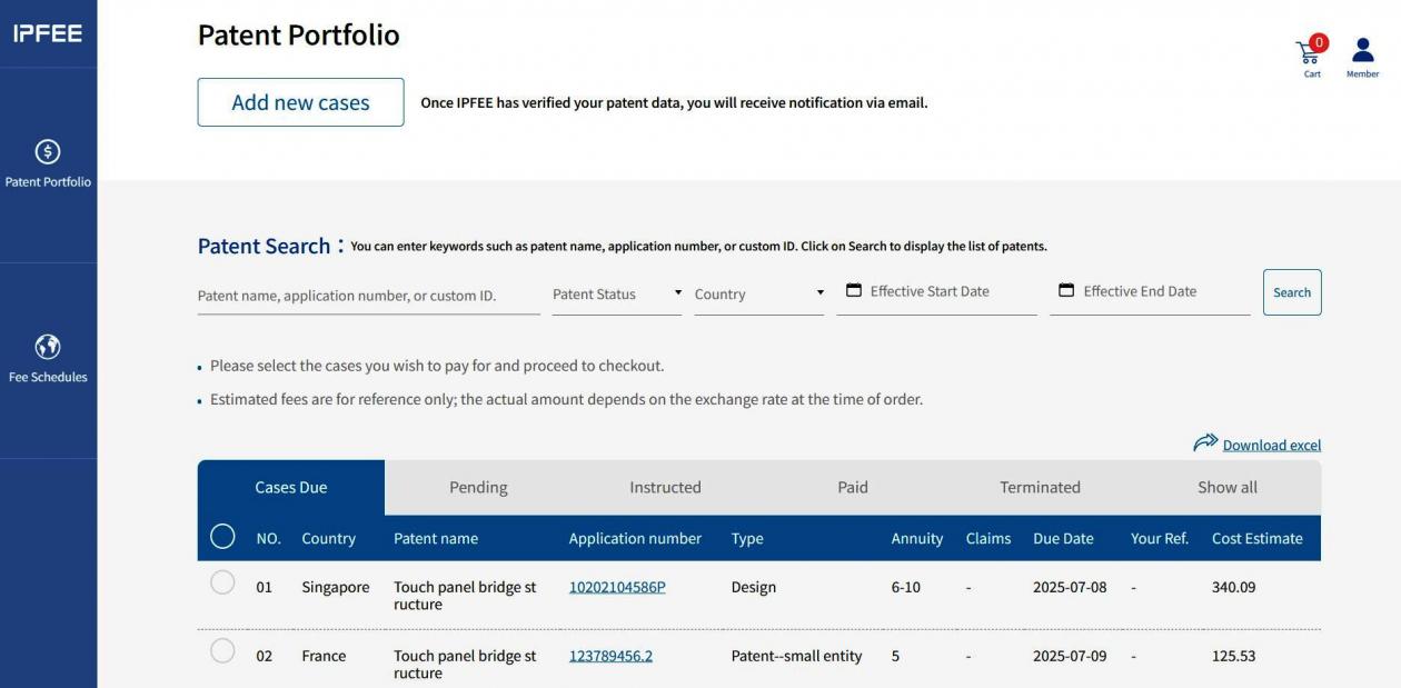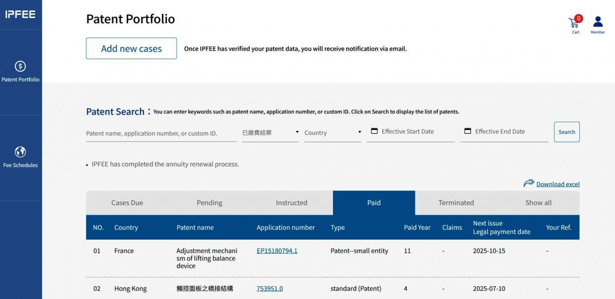 ★ This tab displays Patent cases for which IPFEE has completed payment to the designated national patent authority; as well as cases that have been pre-filed and finalized.