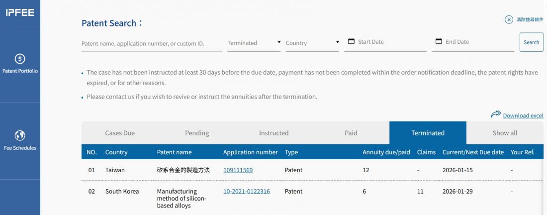 ★ This tab shows PATENT cases for which annuity payment handling has been terminated.