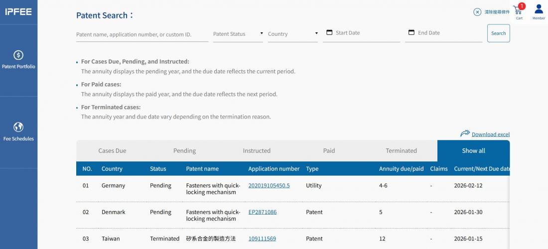 ★The Patent Portfolio function enables comprehensive Patent term management, allowing you to review the status of each case, track upcoming annuity due dates, and view estimated annual fees.
